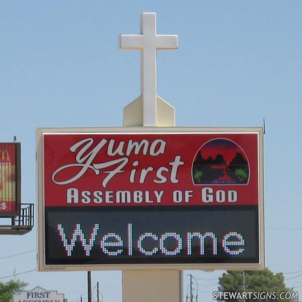 This outdoor LED church sign has a 20mm 24x112 LED display with a 5' x 8' sign cabinet.